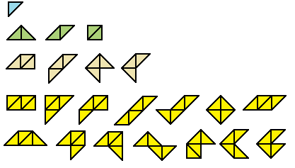 Polytans (also polyaboloes, depending on which website you're looking at) are the shapes made from joining isoceles right-angled triangles (45-45-90 triangles, or the triangle you get when you chop a square in half diagonally) together edge-to-edge. Theres one 1-tan, which is just the triangle on its own, then three 2-tans, four 3-tans (tritans? triaboloes?) and 14 tetratans/tetraboloes. The numbers grow colossally fast compared to the numbers of polyominoes, polyiamonds or just about anything else; probably because there's often more than way to append a triangle to an edge.