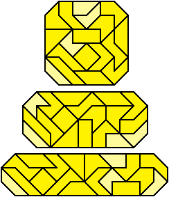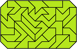 There are 30 of these in total. Mine are made of MDF, lightly toasted by the laser that cut them. 30 multiplied by 2.5 gives a total area of 75 unit squares, which feels like it should be a good thing; it's not prime or anything. But it means that for rectangles (the most obvious shape to try and pack a set of pieces into) we've only got one option - 5x15 - and it just doesn't seem to be possible. I've tried by hand, and I've let Peter Esser's mops solver churn away at it in the background while writing this, and it seems to get a maximum of 29 pieces placed but no higher. I'm wondering if parity has a filthy triangular cousin, or maybe there's a lack of available orthogonal edge sections within the set of pieces to fully build a rectangle with 40 units of edge.