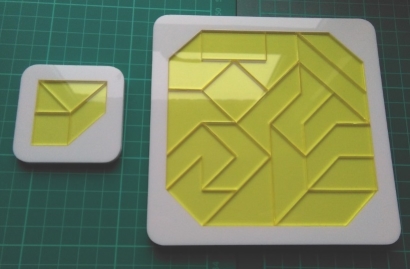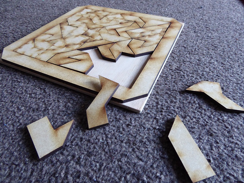 On the back of the tray I made for my set there's the following configuration, which is just unfairly difficult. The centre requires the square-shaped bit, leaving the remaining 17 pieces to fill the square doughnut around it. There are 30 solutions to this but finding even one of them manually is something of an ordeal (click here too see them if you don't want to have a crack at solving it yourself first.)