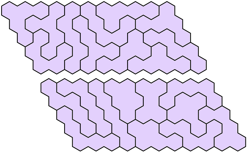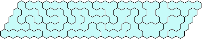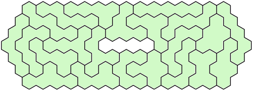 Then there's hexagons. This ones has an internal hole in order to bump the total area up - there may be 110-cell hexagons which work and have some symmetry, but I couldn't be bothered to search thoroughly for them.
