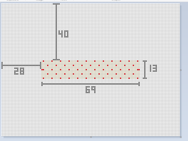I settled on 93x125 with 60 holes - two domino holes and 56 monomino ones. Using MS Paint zoomed right in so you can see the grid and the individual pixels is a godsend for fleshing out things like this, finding a nice configuration, checking it's symmetrical and counting how far from the borders the holes all are for ease of construction. the end result was this: