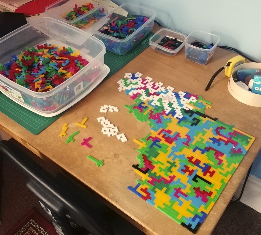 The grille I'd picked for the holey pieces was tougher than I'd anticipated - the pieces just needed to be too close together and that sort of forced specific pieces to go between them. And looking for those specific pieces was a tedious affair. I then realised that with like 56 holes and only 37 or whatever holey pieces, I didn't need to pack them so closely, but I'd already done like 20 by that point (it was late and I was tired, okay) so they were staying like that. Then a case of counting and checking like 5 times to make sure the number of units between the end of the domino-shaped hole and the edge of the rectangle was the same as that in the blueprint. I wasn't about to have a repeat of last time.